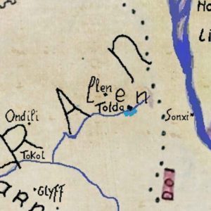 Oorspronkelijk was dit de hoofdstad van Lin, in die tijd was de naam Toldamerin (“Verheven Stad met Tuinen”). Op miraculeuze wijze ontsnapte het stadscentrum aan de grote verwoestingen door de Zîn waarmee de teloorgang van het Lin-volk werd ingeluid. De toenmalige, laatste stadsvorst van Toldamerin, Iospar geheten (zie Boek 1, Proloog), weigerde het bevel om de stad af te breken op te volgen. Hij werd door de legercommandant van de Zîn uit woede van de hoge regeringstoren geworpen. De Zîn hadden niet voldoende kennis en technische hulpmiddelen om de totale vernietiging van Toldamerin uit te voeren en na meerdere vruchteloze pogingen dropen de veroveraars af. De bevolking van Lin werd volledig uitgemoord. Vage legenden beweren dat sommigen konden ontsnappen, maar het is onduidelijk waar zij heen zijn gegaan. Naar verluidt hebben enkele duizenden Lin de delta van de Salwen weten te bereiken en zich daar gevestigd, maar ook dorpen in het oosten, zoals Kathy, Rinok en Gonnif kunnen hun ontstaan te danken hebben aan gevluchte inwoners van Toldamerin en andere delen van het land. Ten tijde van Lyss hadden de bewoners van Tolda geen besef van de oorsprong van hun stad. Ooit was de mythe in omloop gekomen dat deze stad door de Doi zelf was gebouwd. Voor het gigantische zwevende plateau uit steen waar het stadscentrum op gebouwd was, leek dit de enige logische verklaring, want mensen konden zo’n plateau niet bouwen.
